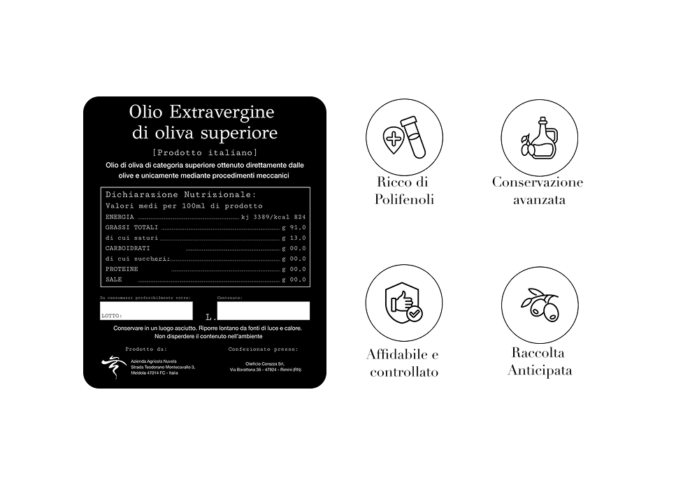 Evo 100% Italiano: raccolto, prodotto ed imbottigliato a Longiano nella provincia di Forlì-Cesena,